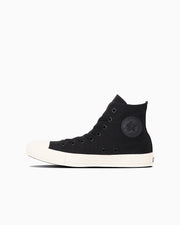 ジッパーを外側に配し脱ぎ履きしやすく、ハトメやジッパー、星のスタッズ、アンクルパッチをマットな質感のブラックで統一。
