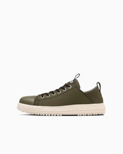 アッパー素材として、軽くて丈夫なクラレ社のクラリーノを使用。無骨な印象の深いモスグリーンをアッパーカラーとして取り入れたデザインは魅力的。