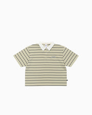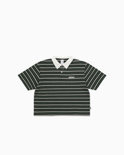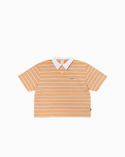 綿ポリエステルの先染めボーダー生地を採用した半袖の襟付きトップス。