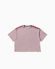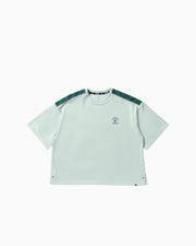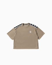 シェブロン&スターロゴのテープを肩に配したTシャツ。吸汗速乾素材を採用。左胸にクラシックなアーチ状のロゴデザインを配置し、裾にはデザインのアクセントとなるスナップボタンをプラスしました。