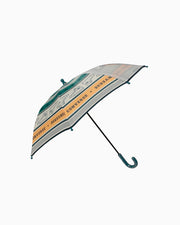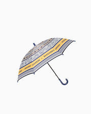 ボーダーモチーフのキッズ 傘。ネイビーとグリーンの落ち着いたベースカラーにイエローとオレンジをアクセントに配置した2色展開。1コマ透明で視界が確保できます。
