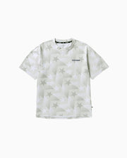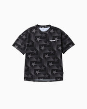 シェブロン&スターロゴを活かしたシーズナルグラフィックの総柄Tシャツ。 吸汗速乾性に優れたコットンライクな素材を採用。