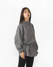 撥水性のあるポリエステル素材のアノラックジャケット。ウエストのドローコードによってシルエットのアレンジが可能。フロントの大きなポケットもポイントで、機能性とデザイン性を兼ね備えたアイテム。