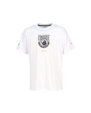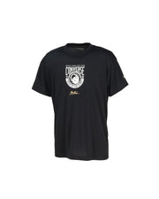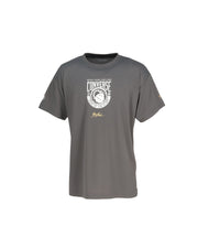 吸汗、速乾性のある機能素材を使用した、シンプルなフロントプリントTシャツ。左袖とフロントの金糸刺繍がポイント。