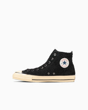 毛足の長いブラックのスエード、トウやインソールに入った手描きのテキストやシューレースに通したメタルがポイントになったデザイン。アウトソールには印象的なブルーを採用。