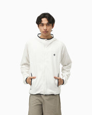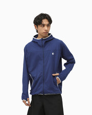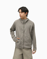 UPF50+の機能を持つ生地を使用したフード付きジャケット。ランニングや日焼け予防にも重宝するサムホールを採用。配色のパイピングデザインがアクセントの1枚。