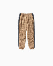 シェブロン&スターの総柄を全面にプリントした、ミリタリーライクなデザインが特徴。サイドのラインと膝まわりに施したタックで動きやすさをプラス。トレンド感のあるゆったりとしたシルエットのデザインを採用。