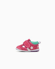 また、ワンベルトタイプのデザインは、親御さんが子どもの靴を簡単に脱ぎ履きさせることができるため、忙しいお出かけの際にも便利です。夏を思わせるポップで明るいブルー/イエローとピンク/ターコイズの2カラー展開。