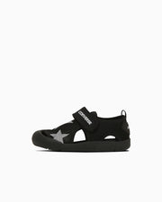 コンバースらしい大きなスターをアッパーに大胆にあしらった、ワンベルトタイプのデザインで、脱ぎ履きしやすいデザインを採用。