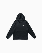 吸汗速乾の機能を持つ光沢感のあるポリエステル素材のスウェット生地を採用したプルオーバーパーカー。フードのスナップボタンと左胸のシェブロン&スターのロゴワッペンがポイント。スポーティーなシーンでもスマートに着用が可能なアイテム。