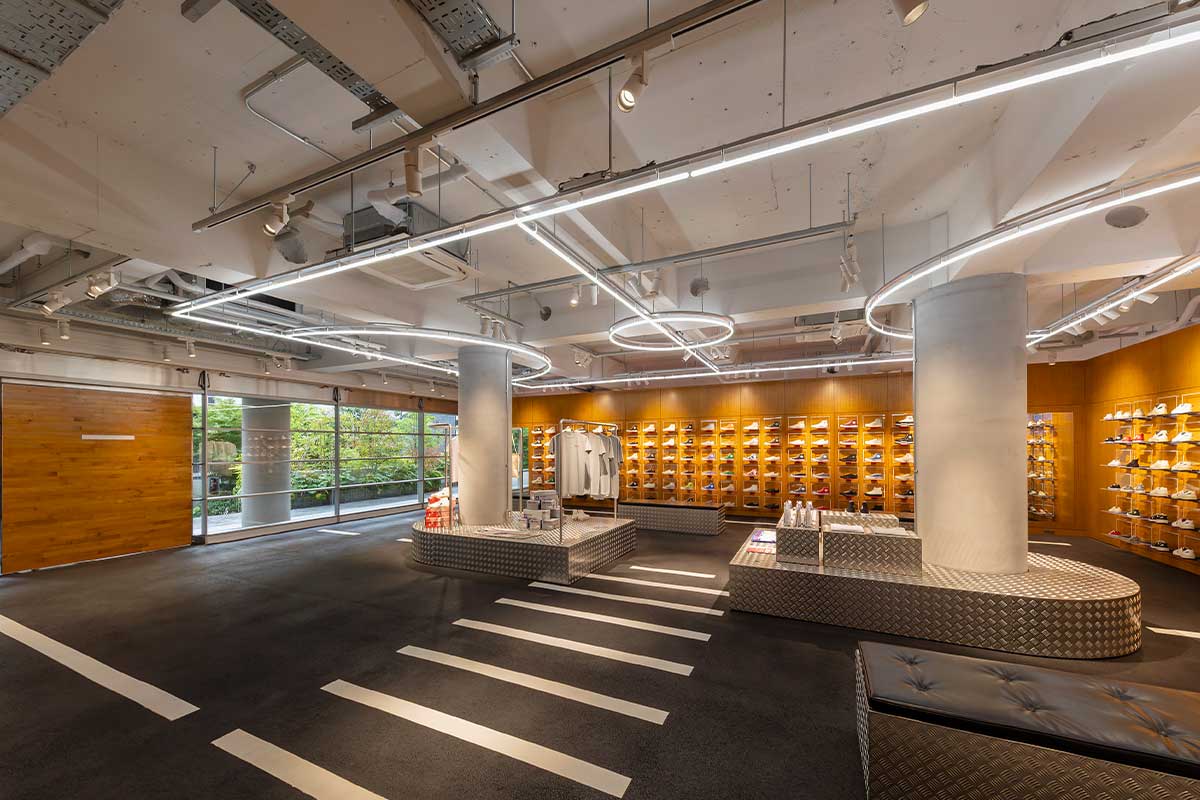 フロアに大胆に敷設したアスファルトや、バスケットゴールをモチーフにしたシューズディスプレイなど、コンセプトを体現したデザインが、唯一無二の世界観を演出しています。