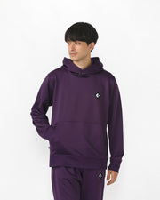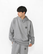 吸汗速乾の機能を持つ光沢感のあるポリエステル素材のスウェット生地を採用したプルオーバーパーカー。フードのスナップボタンと左胸のシェブロン&スターのロゴワッペンがポイント。スポーティーなシーンでもスマートに着用が可能なアイテム。