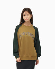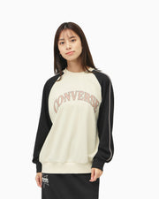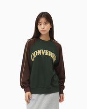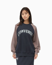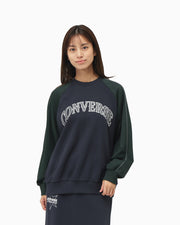 フロントに凹凸感のある刺繍風プリントで施されたCONVERSEロゴや、袖部分の配色のパイピングがポイント。