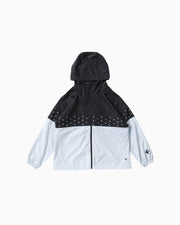 ドット風の総柄スタープリントを切替に使用した、撥水性のあるウーブンジャケット。 裾に配したドローコードでシルエットの調整や風の侵入を防ぐことができます。 総柄スタープリントがスタイリッシュで遊び心のある一着です。