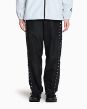 撥水性のあるウーブン素材を使用した、ドット風の総柄スタープリント切替のパンツ。左足に縦に配置されたロゴが特長。 アクティブなシーンで快適に着用できます。